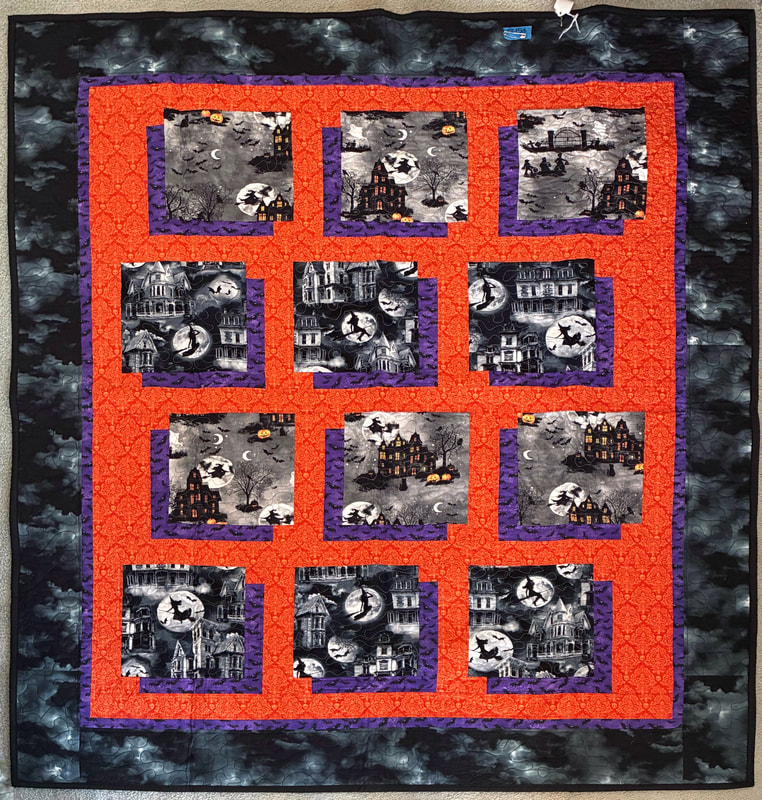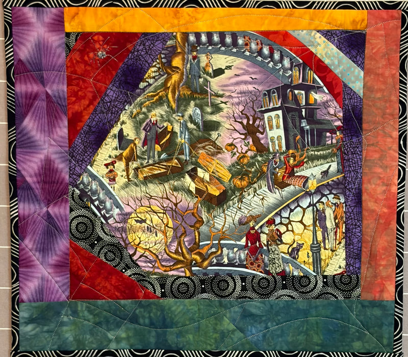 - Photo 1 (ID01): Midnight Haunts, 19.25" x 17.5", $45. Halloween panel with lots of Halloween scenes and some patchwork.