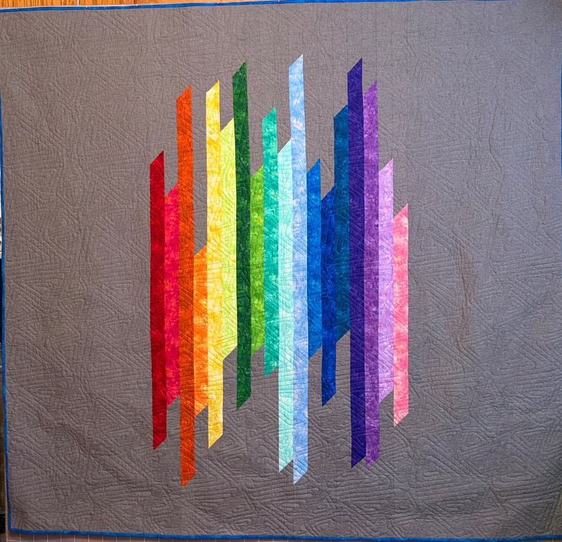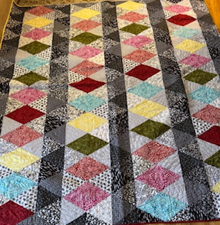 - Photo 4 (ID04): Color Cascade, 66" x 99", $350. This quilt features a striking diamond-in-a-row layout, where colorful diamond shapes appear to float between columns of bold grayscale fabrics.