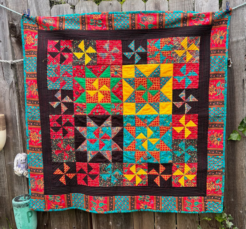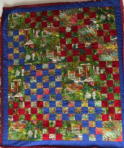 Photo 1 (ID29): Through the Garden Gate, 40" x 45", $250. Made in a Guild Workshop. Colorful back. Precise piecing. 100% cotton fabrics. 100% cotton batting. Nine patch (solids). Incorporating focus fabric. (garden).