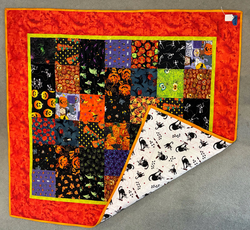 Photo 2 (ID18): Cozy Halloween, 42" x 48", $95. A perfect lap quilt for handing out candy or for your favorite trick-or-treater with a cute cat flannel back.