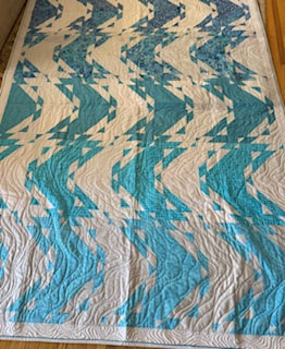 - Photo 2 (ID02): Ocean Breeze Quilt, 57" x 78", $300. This quilt features a striking zig-zag pattern that flows from deep blue at the top to bright turquoise and soft aqua near the bottom, creating a beautiful ombré effect.
