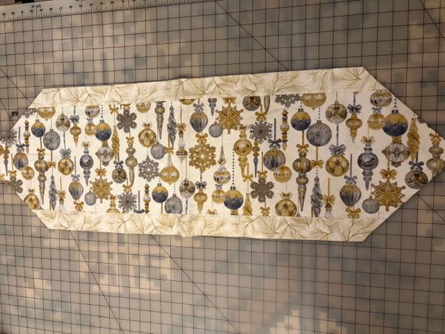 Photo 4 (ID20): Christmas Baubles, 13" x 41", $15. Table runner with ornament fabric in cream, gold, and silver.