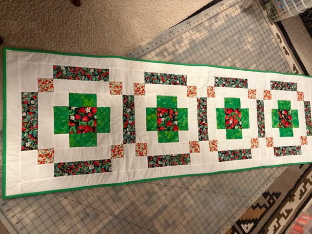Photo 3 (ID24): Strawberry Fields, 20" x 62", $50. Pieced table runner in a variety of strawberry fabrics with alternate white blocks.