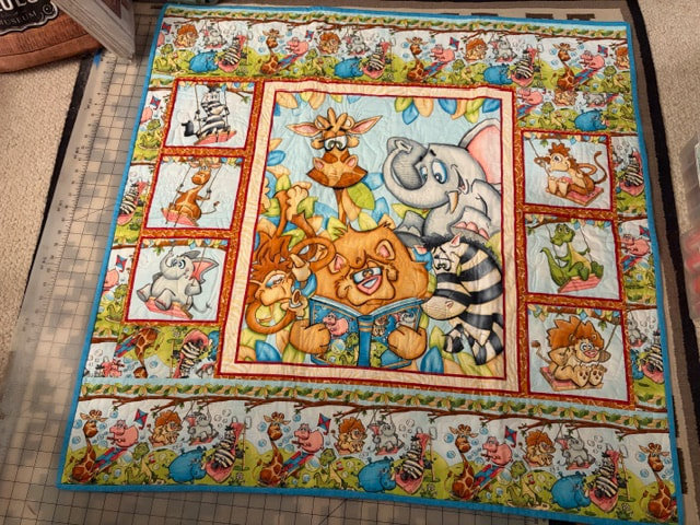 Photo 4 (ID25): Zoo Animals, 36" x 44", $50. Youth quilt with zoo animals with center panel surrounded by smaller blocks.