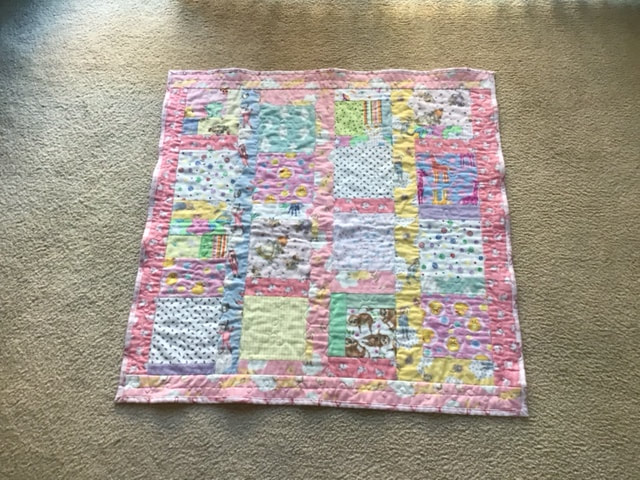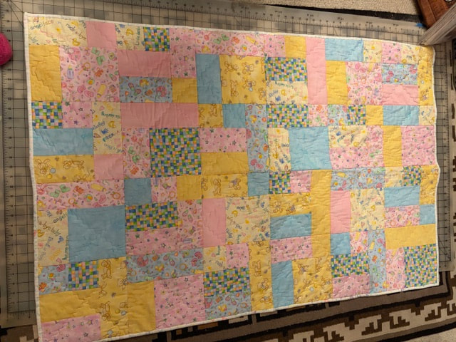 Photo 1 (ID27): Cracker jacks baby/youth quilt, 36" x 54", $50. Variety of small pastel flannel blocks.
