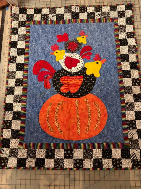 Photo 2 (ID28): Crazy chicks quilt/wall hanging, 32" x 39", $45. Small quilt/wall hanging with center panel with a stack of chicks surrounded by black/white checkerboard border.