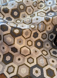 - Photo 3 (ID03): Honeycomb Harmony, 63" x 83", $300. This quilt features a beautifully intricate hexagon pattern arranged in a honeycomb-style layout.