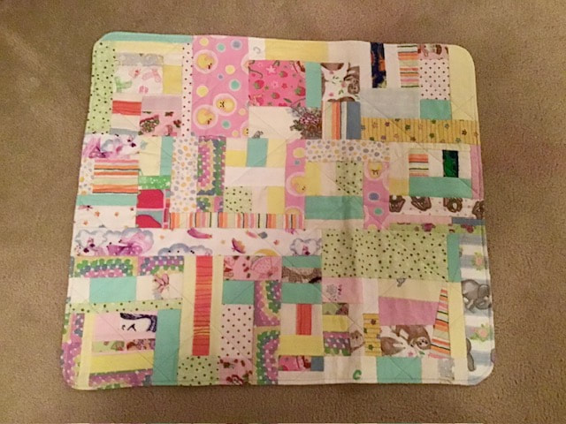 Photo 3 (ID33): Hugs, 23" x 26", $20. Soft, colorful, three-layered flannel baby blanket or pad with scrappy prints and polka dots.