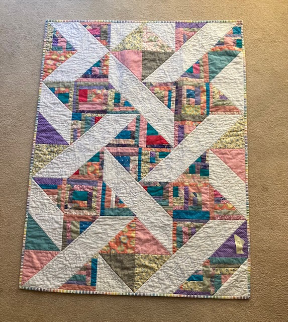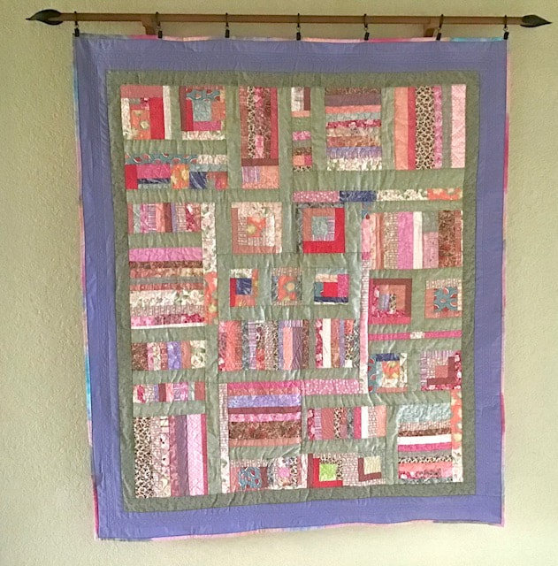 Photo 3 (ID36): Pink Puzzle, 44" x 52", $75. Pink strips have been sewn into blocks of varying sizes and patterns mixed in with pale green sashing. The border is lavender and the binding and back tie-dye pastels.