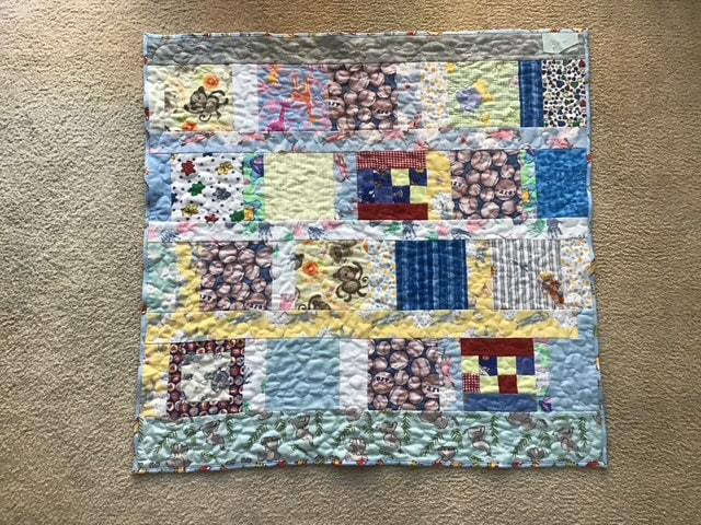Photo 5 (ID40): Baby Blue, 36" x 37", $35. Baby quilt/pad made of three layers of flannel with sports and animal blocks.