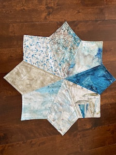 Photo 1 (ID 41): Beachy Table Topper or Wall Hanging, 25" x 25", $25. A fun beachy table topper made up of multiple seaside fabrics. Would also make a nice wall hanging.