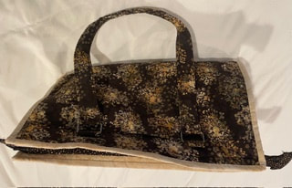 Photo 4 (ID44): Batik Tote/Project Bag, 17.5" x 15" x 5", $35. Bag is made of brown batik with shoulder straps, side pockets, and six inside pockets.