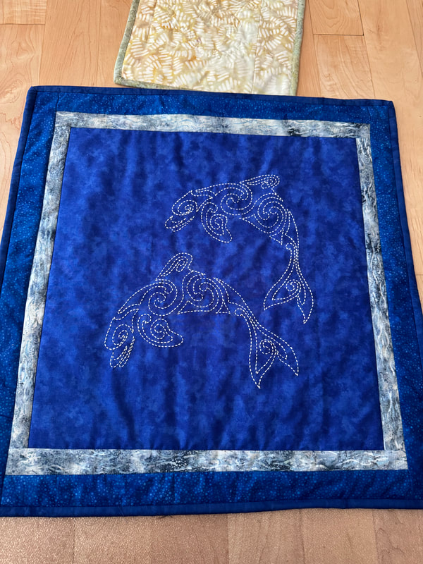 - Photo 2 (ID07): Dolphins at Play, 21" x 21", $30 This is a Sashiko panel designed by Sylvia Pippen.