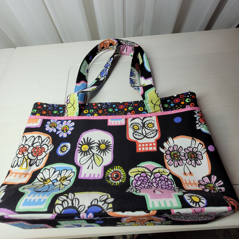 Photo 1 (ID85): Day of the Dead Tote Bag, 16” x 18” x 45", $40. Tote bag with zipper closure, 2 outside pockets and 8 inside pockets.