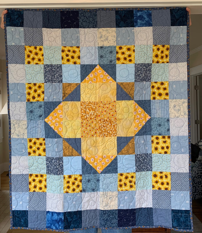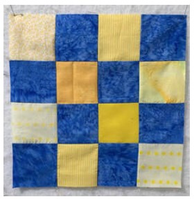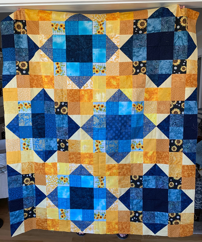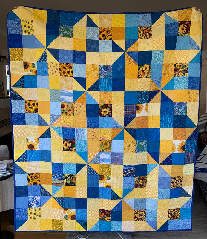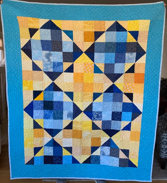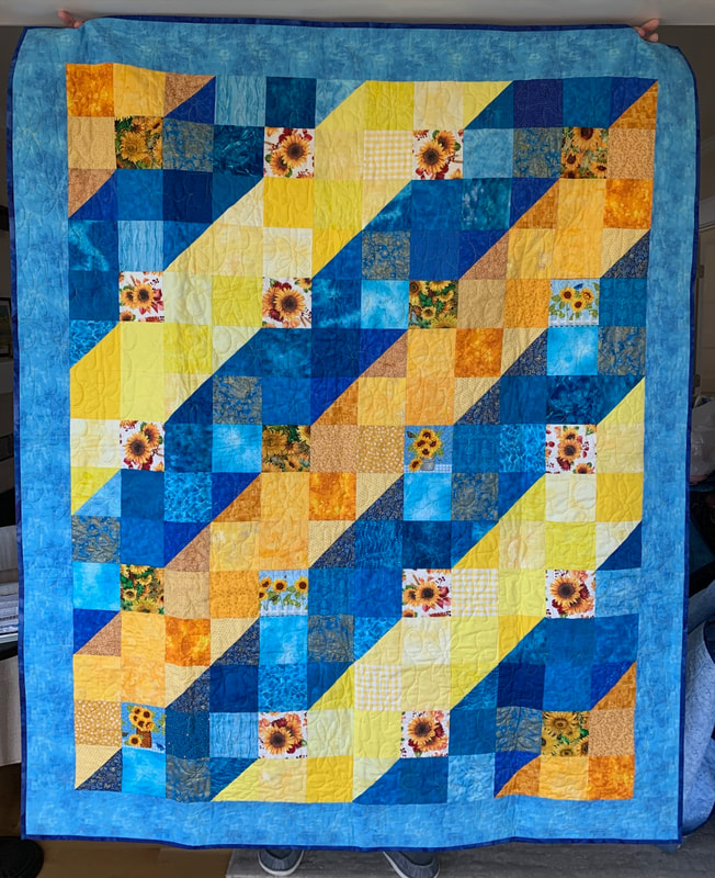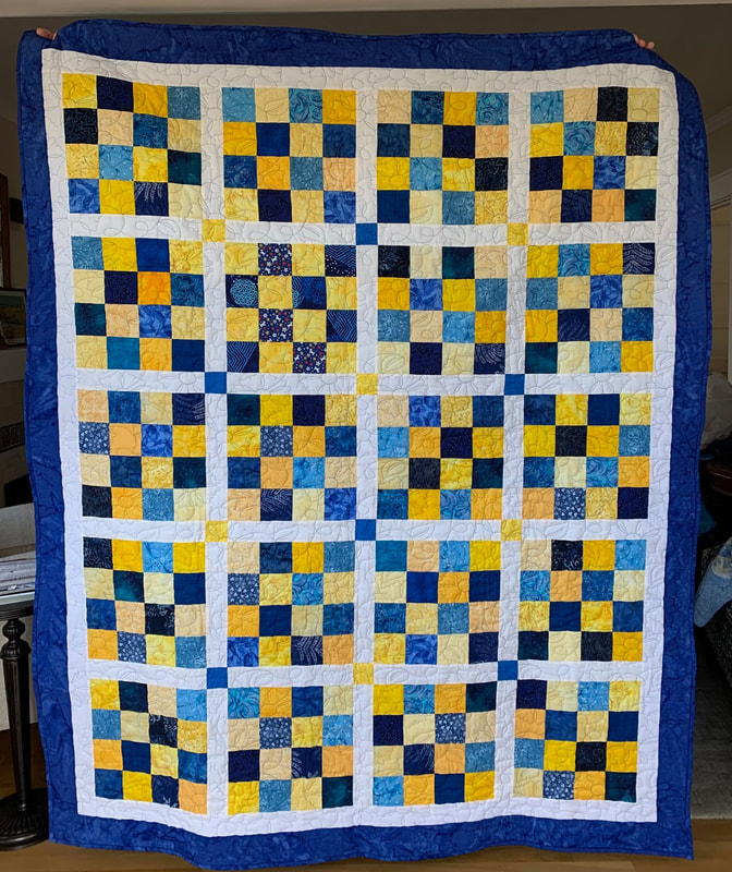 In 2022, our first project used 12" Perkiomen blocks (blue and yellow with a sunflower center), creating twelve quilts measuring 60" x 72", and our second project used 12" 16-patch checkerboard block with alternating blue and yellow squares, creating five quilts.