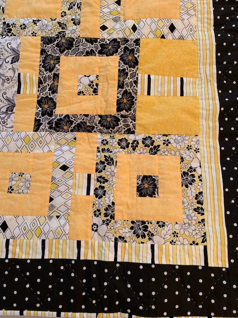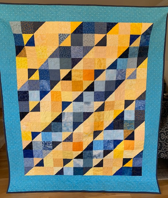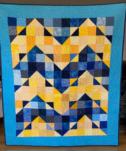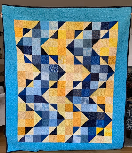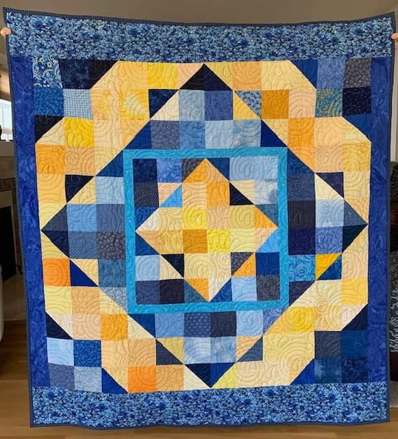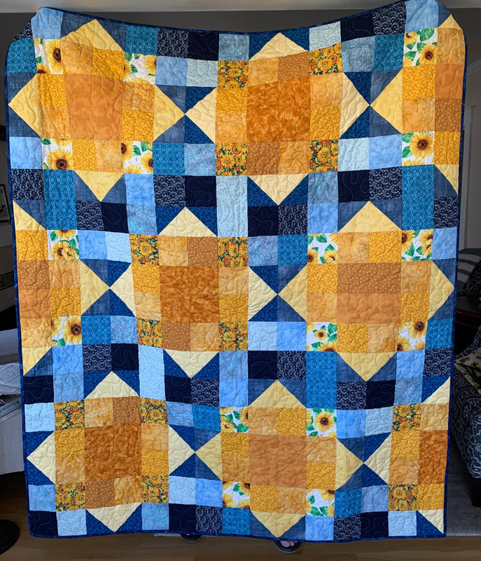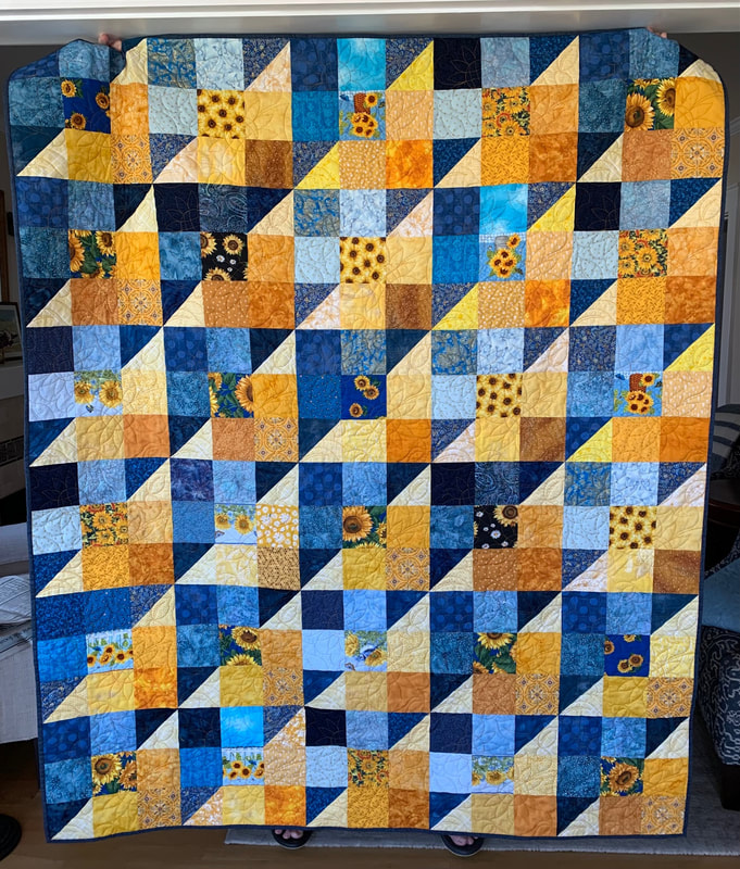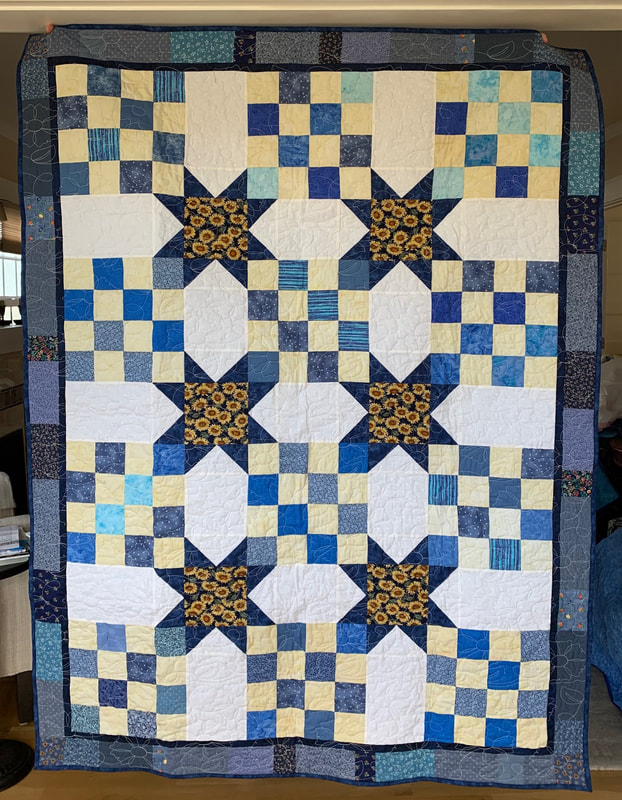 In 2022, our first project used 12" Perkiomen blocks (blue and yellow with a sunflower center), creating twelve quilts measuring 60" x 72", and our second project used 12" 16-patch checkerboard block with alternating blue and yellow squares, creating five quilts.