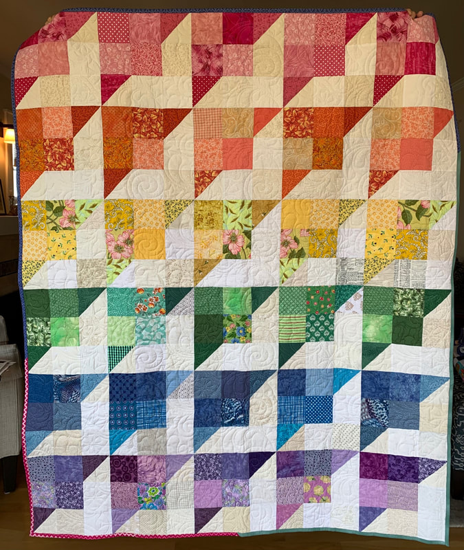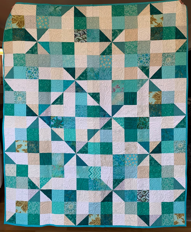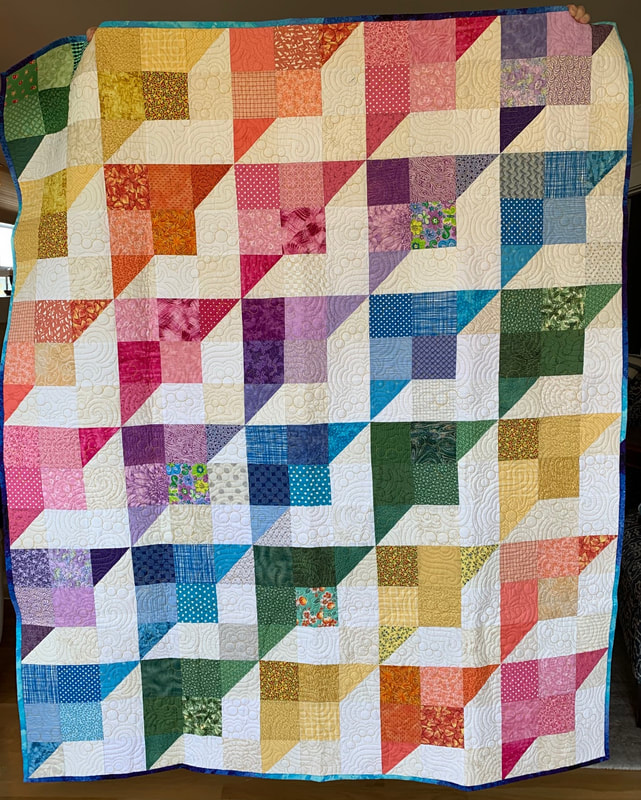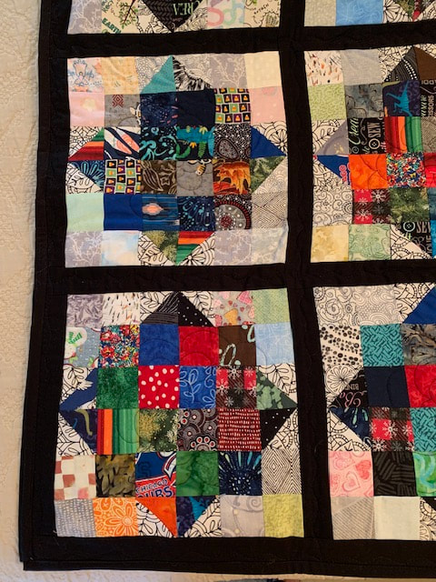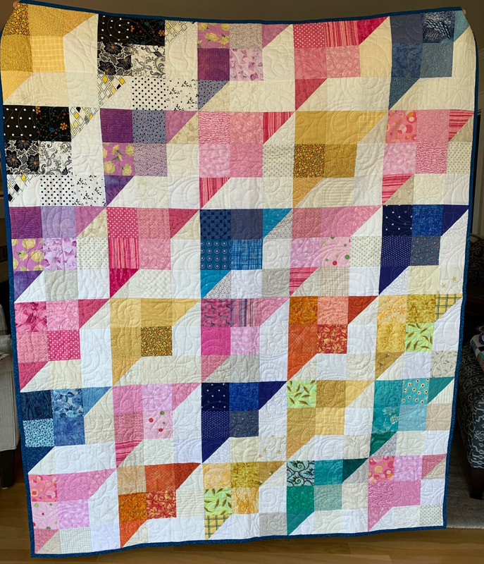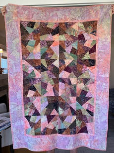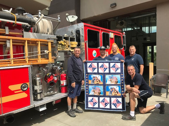 A Torrance Fire Engineer contracted COVID-19 on the job. SBQG 1st Vice President Melanie and President Julie delivered a batik quilt to Firehouse #1 to comfort him during his recovery. Blocks for the "disappearing 4-patch" quilt were made by guild members with fabric donated by Private Source Quilting, assembled by Melanie and Marie, quilted by Matt Randall and bound by Jenifer.
