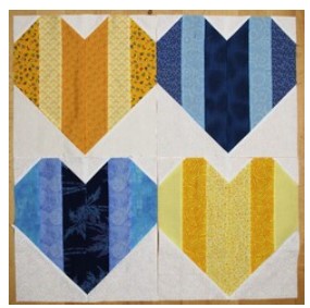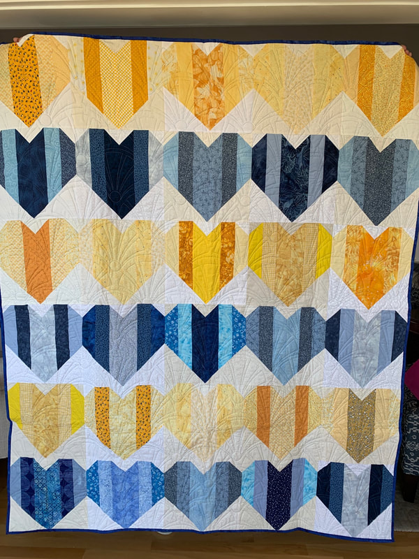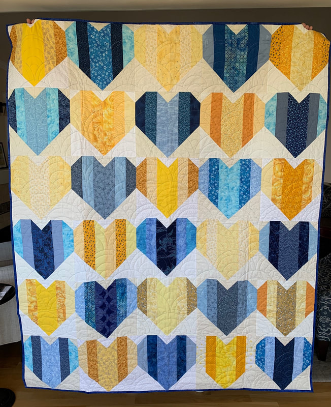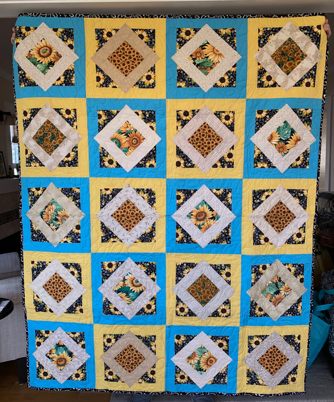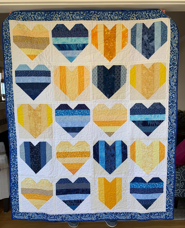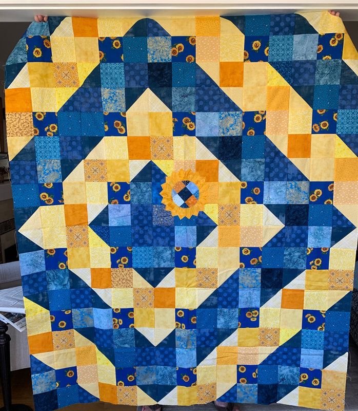 In 2023 our projects for Ukraine included Heart blocks, made in either blue or yellow, and a white or off-white background (12" finished), and blocks made using the "Boxed In" pattern (available at no charge online) using sunflower fabric, creating eight quilts. We delivered eighteen quilts to Wrap the World in Quilts, and seven of the quilts made with Perkiomen blocks were donated to organizations to assist the refugees in Poland.