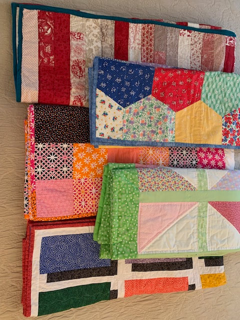 These 8 quilts (4 twin, 4 lap/child) and 1 baby quilt were sent to Hancock's of Paducah in December 2021 for the Kentucky tornado relief effort.