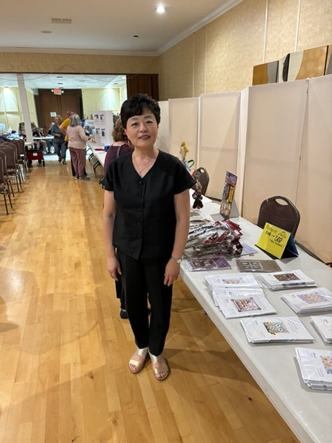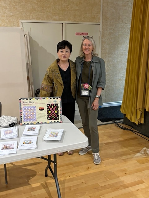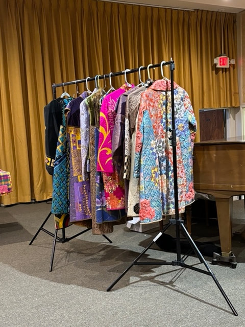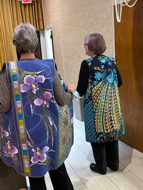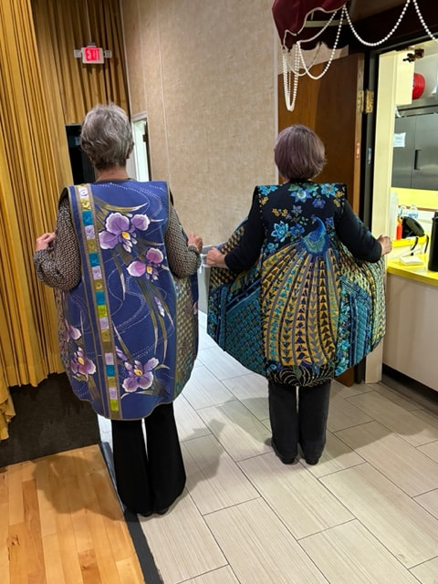 Our October speaker, Rami Kim, was with us in person and brought her delightful sense of humor and stunningly beautiful garments, quilts, and bags as she spoke on imagination-fueled wearables in her presentation “Two by Two.” Several of our guild members did a great job “modeling” and showcasing the fabric, intricacies, textures, and details in her garments.