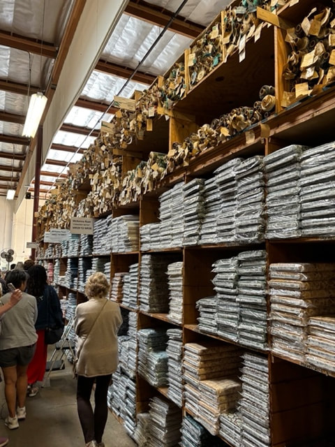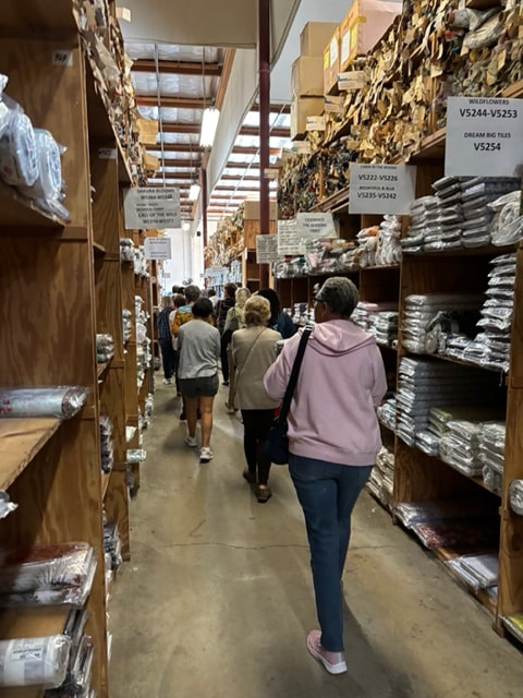 Picture #1 & #2: Walking through the stacks and stacks of fabric (Hoffman creates 500 different fabrics 3 times a year!)