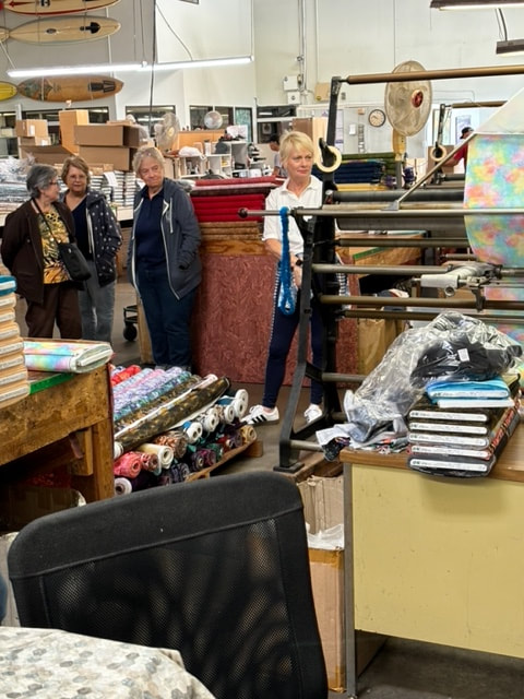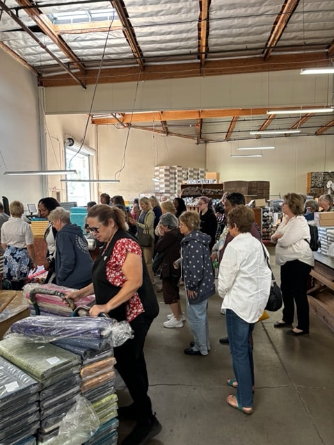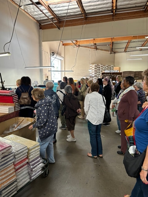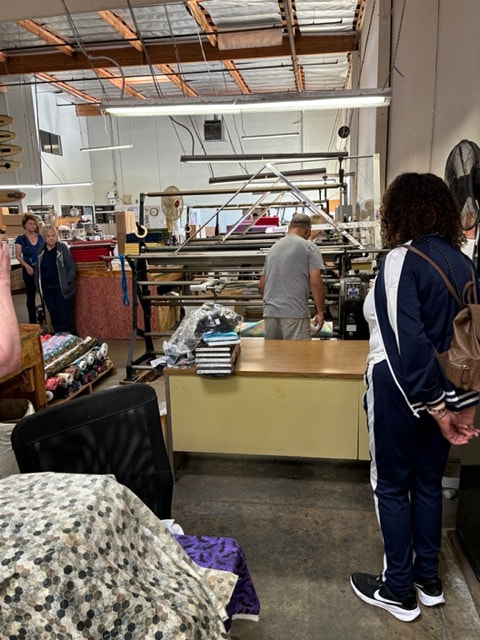 Twenty-nine (29) members of the SBQG and African American Quilters Guild of LA (AAQGLA) had a WONDERFUL trip to Hoffman Fabrics. We learned so much about their 100 year history and the manufacturing of batiks from our host Jean. Hoffman provided each guest with a wonderful hostess gift and had a sale table of kits and precuts for purchase. Many of us went on to Quilt Passions where many of us bought even more batiks and patterns. And some of us even went onto M&L where we bought even more fabric (you can never have enough fabric!) It was a great time for all!