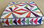 Becky McDaniel (In Person) Saturday, March 21, 2026 "Crazy Cushion" Paper pieced with 3 different pattern designs: Star Jasmine, Pineapple (Not showing) and Flying Geese. It has a zipper and a strap for carrying to wherever you need to have a cushion! Size 16"x16"x3" |